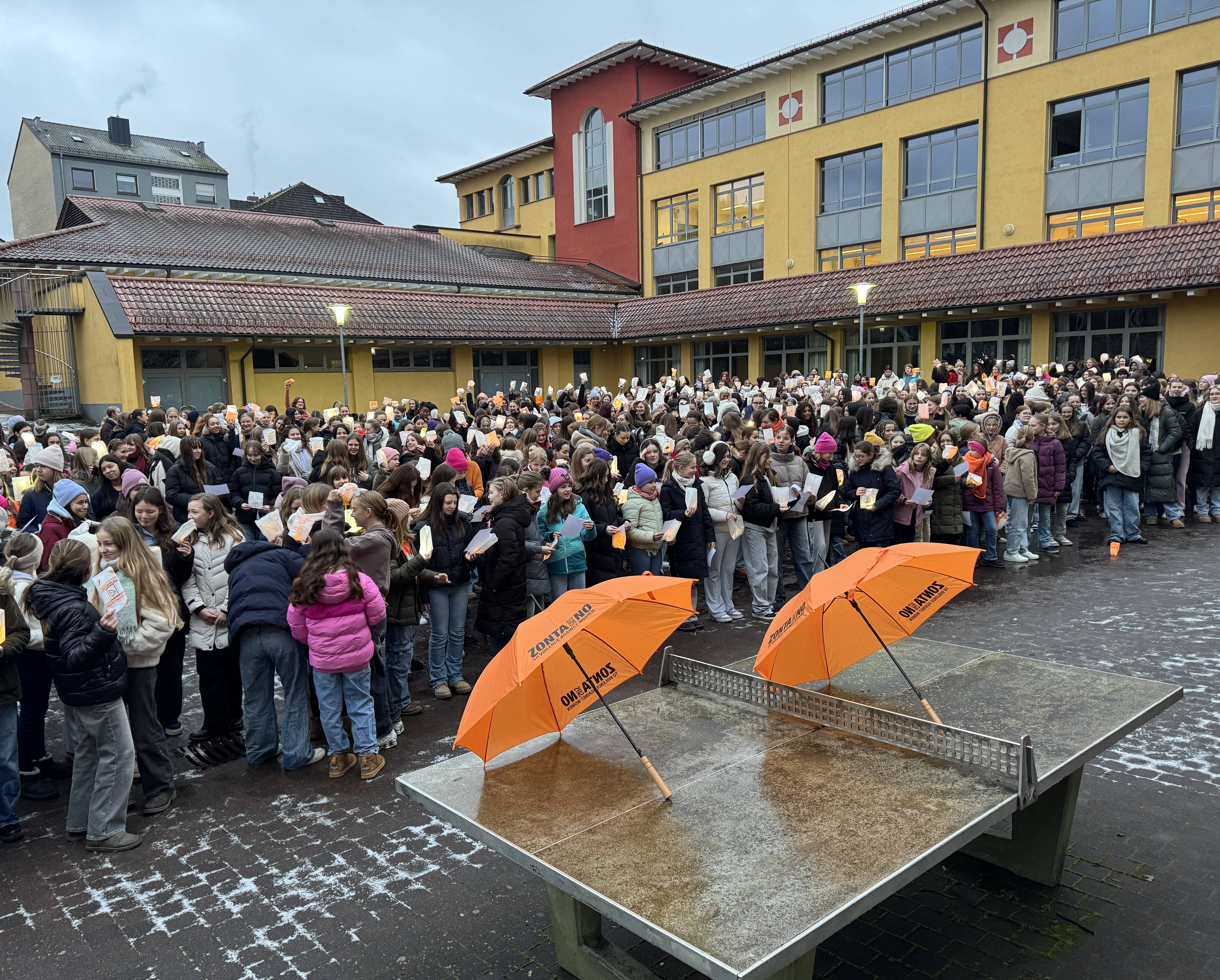 Am Aktionstag gegen Gewalt an Frauen und Mädchen, der vom Zonta-Club international unterstützt wird, fanden sich alle Schülerinnen der MWS zum Start in den Schultag im Pausenhof ein, um gemeinsam ein Leuchtzeichen gegen Gewalt zu setzen. Gut ausgerüstet mit selbstgestalteten Lichthaltern in der Farbe Orange, auf denen jede Schülerin ihre individuelle Botschaft zum Thema notiert hatte, und mit passenden Lichtquellen entstand ein beeindruckendes Lichtermeer, das die Morgendämmerung durchbrach. Kräftig leuchtete auch die orangefarbene Kleidung, die viele an diesem Tag gewählt hatten, um ihre Solidarität zum Ausdruck zu bringen. Zeitgleich wurde das Lied „Titanium“ von David Guetta gespielt, das viele zum Mitsingen animierte. Die Schülersprecherinnen moderierten diese Aktion mit wertvollen Informationen und animierten zum Schwenken der Lichter. Bereichert wurde die Aktion auch durch die Anwesenheit der Aschaffenburger ZONTA-Präsidentin Frau Gruber. Der Hintergrund des Gedenktages ist der Mord an den Schwestern Patria, Minerva und María Teresa Mirabal. Die drei Frauen hatten sich in der Dominikanischen Republik gegen die dortige Diktatur zur Wehr gesetzt. Nach monatelanger Folter wurden sie zunächst freigelassen, am 25. November 1960 jedoch ermordet. In Deutschland erlebt alle drei Minuten eine Frau oder ein Mädchen häusliche Gewalt. Das Thema wurde vor der Aktion in den Klassen intensiv und differenziert besprochen.