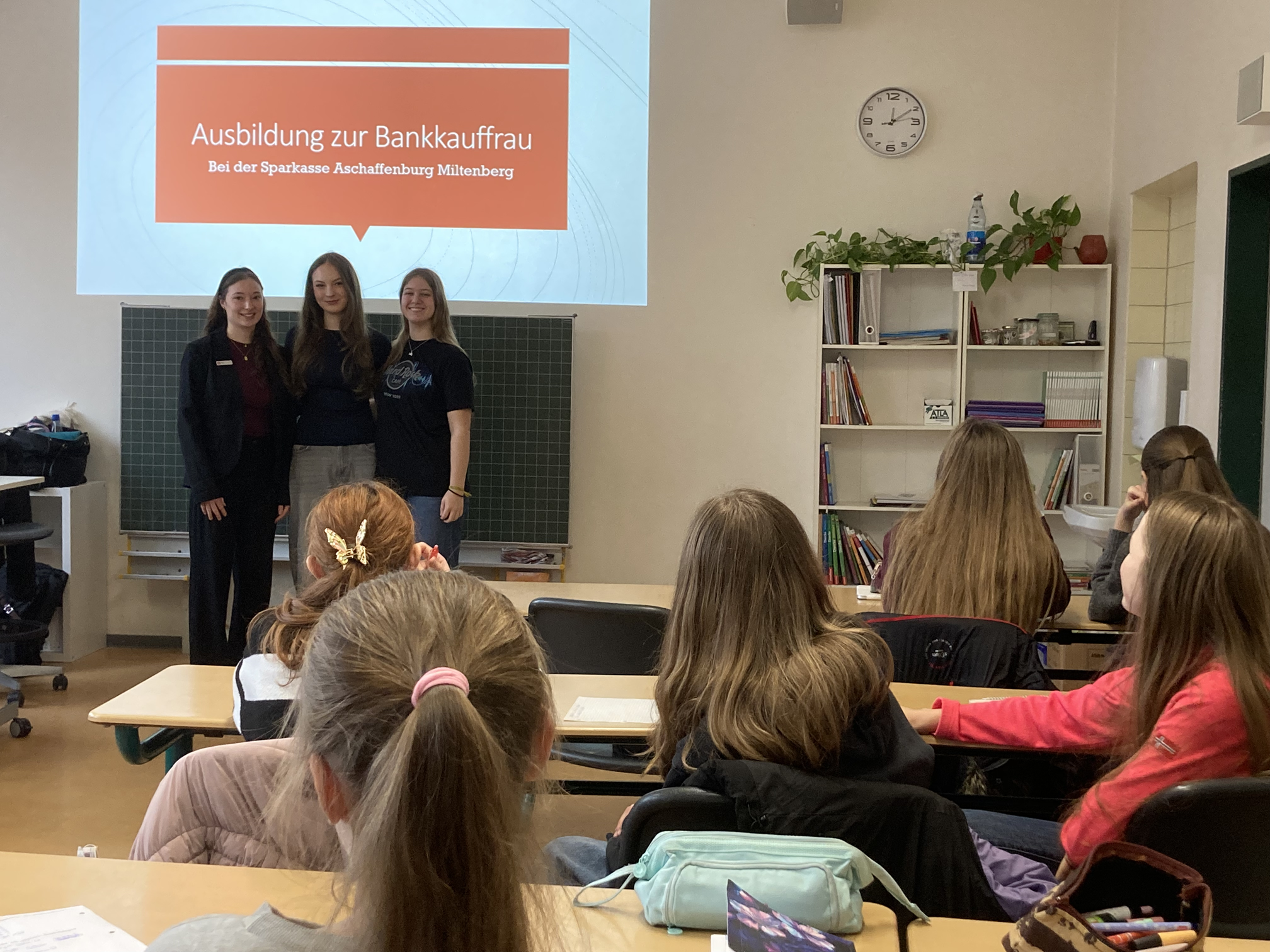 Zum Abschluss konnte Dana Köber, die eine Ausbildung zur Bankkauffrau bei der Sparkasse Aschaffenburg-Miltenberg absolviert, noch einen Einblick ins duale Ausbildungssystem geben. Sie wächst ständig an ihrer Ausbildung, weil sie oft ihre Komfortzone verlassen muss und so mit neuen Dingen konfrontiert wird. Die Mischung aus Berufsschule, Arbeit und Seminaren empfindet sie als abwechslungsreich. Sie machte den Zuhörerinnen Mut, sich in Praktika auszuprobieren, um eine fundierte Entscheidung für einen beruflichen Weg zutreffen, der zu den eigenen Interessen passt und Freude bereitet.