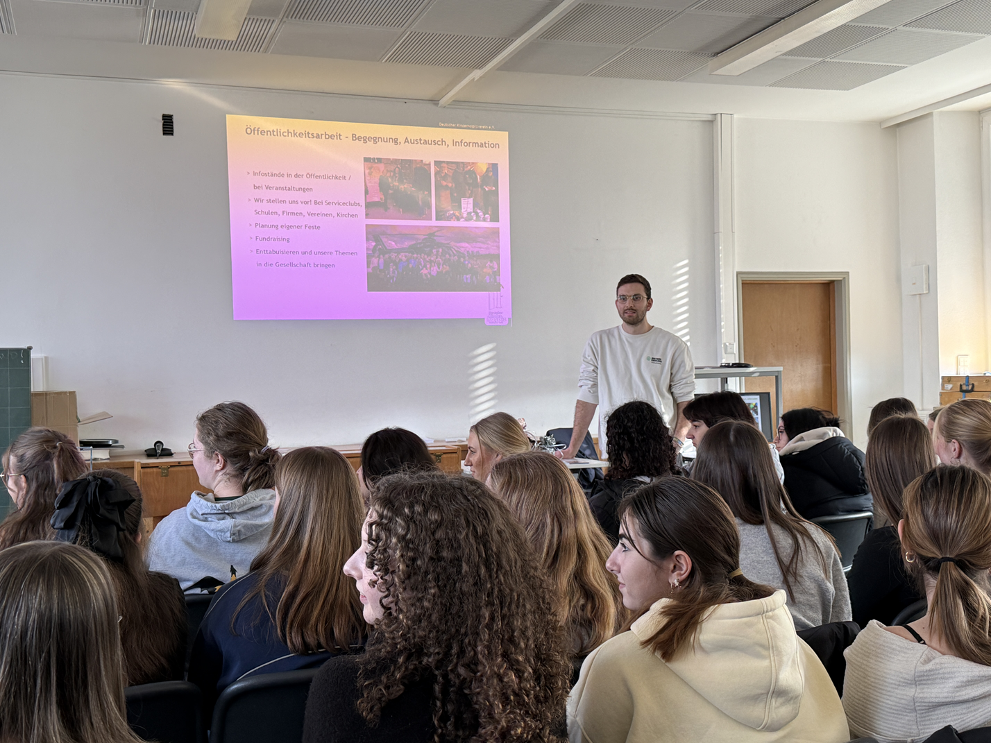 Der Kinderhospizdienst begleitet Familien, in denen Kinder oder Jugendliche lebensverkürzend erkrankt sind. Ehrenamtliche Mitarbeiterinnen und Mitarbeiter schenken Zeit, hören zu, sind da – für die erkrankten Kinder, ihre Geschwister und Eltern. Dabei geht es nicht nur um die letzte Lebensphase, sondern um Unterstützung im oft sehr langen und herausfordernden Alltag der Familien. Die Schülerinnen der 10. Jahrgangsstufe begegneten diesem sensiblen Thema mit großer Offenheit und bemerkenswertem Interesse. Sie hörten aufmerksam zu, stellten viele nachdenkliche Fragen und zeigten viel Mitgefühl und Respekt. Besonders beeindruckend war, wie ernsthaft und wertschätzend sie sich mit den Erfahrungen und Aufgaben des Kinderhospizdienstes auseinandersetzten. Der Besuch hinterließ bei vielen Schülerinnen einen bleibenden Eindruck. Er machte deutlich, wie wichtig Mitmenschlichkeit, Engagement und Solidarität sind – und wie viel Hoffnung und Halt durch Menschen entstehen kann, die sich füreinander einsetzen.